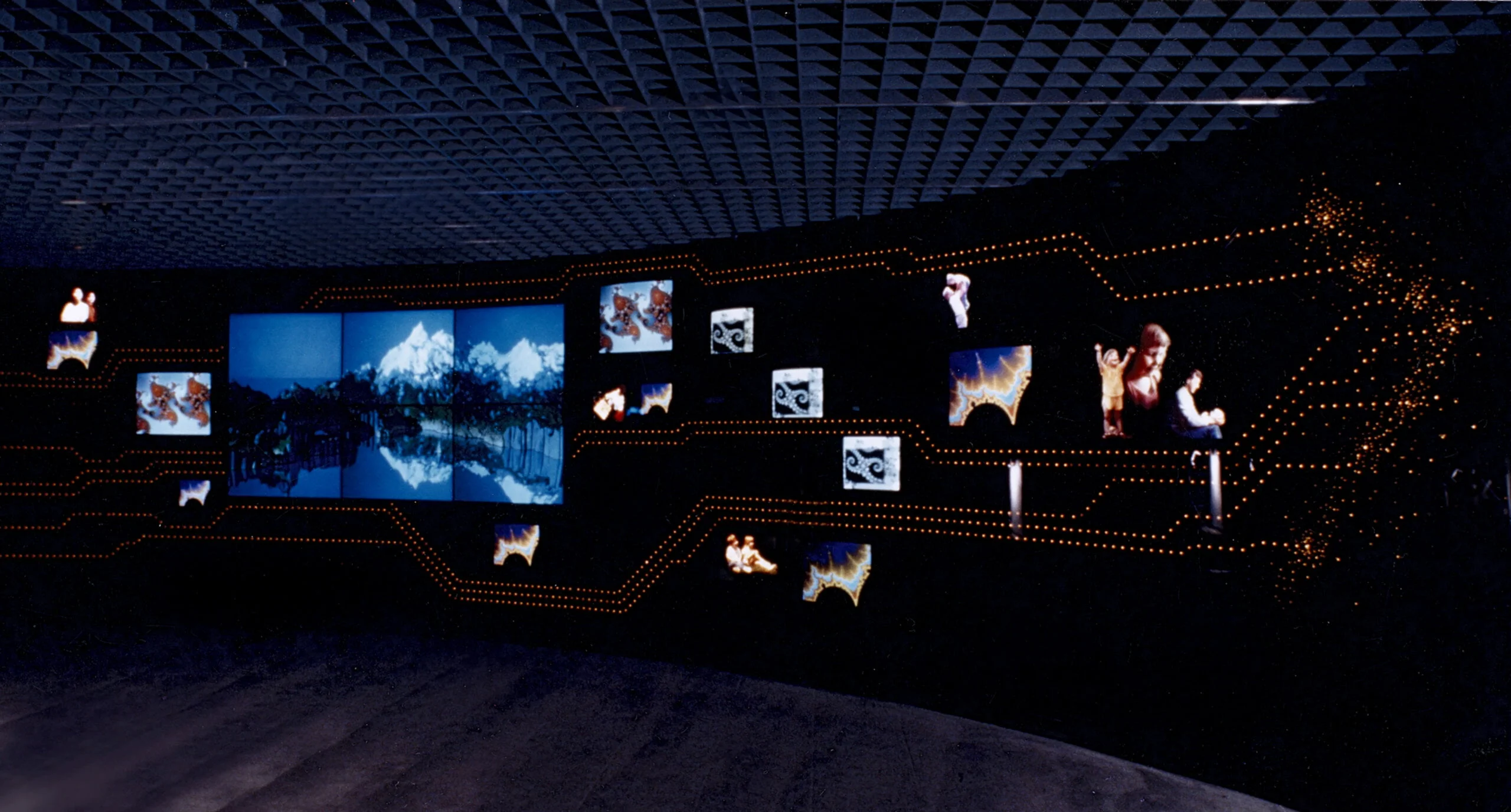 “ A new exhibit premiered at the IBM Gallery of Science and Art …. included a 30 ft. media wall, …. that acts as an introduction to the experience ”. Cuscuna came up with the notion of putting 27 individua l monitors of different sizes in a freeform configuration behind a wall of black plexi – glass. Each screen was edited individually and choreographed in a way so that the “ Wall ” would expand and contract in time to the narration and music. Because of the ple xi – glass, only the lit monitors would appear creating the illusion that the wall ’ s configuration was in a continuous state of flux.